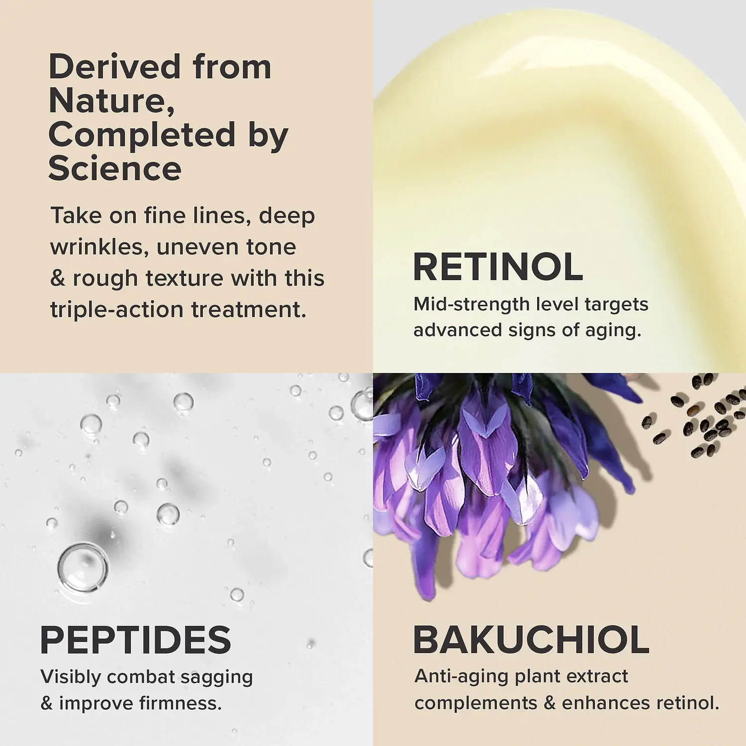 Благодаря активному обновлению клеток кожи при использовании ретинола достигается состояние гладкой кожи без тусклого цвета лица, пигментации и расширенных пор. Его растительный аналог, бакучиол, стабилизирует действие ретинола и снабжает кожу антиоксидантами. Пептиды направлены на многоуровневое омоложение.