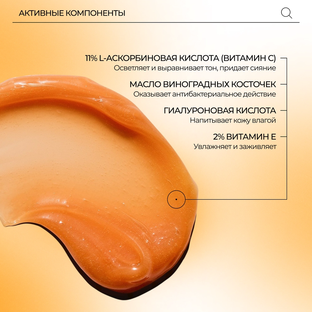 Аскорбиновая кислота (витамин C) 11% — мощный антиоксидант, защищает от УФ-излучения, повышает упругость, осветляет пигментные пятна и следы постакне.