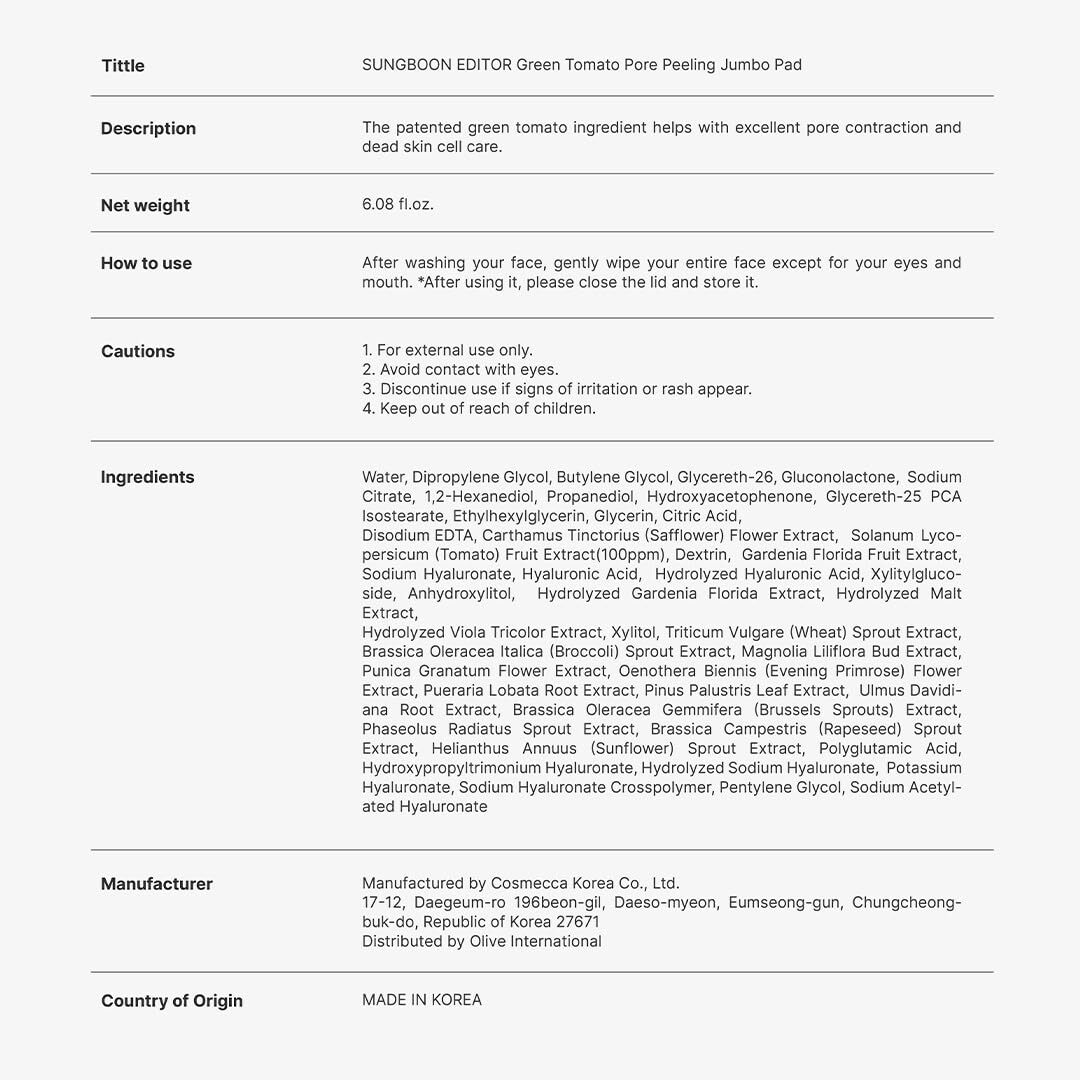Sungboon Editor Green Tomato Pore Peeling Jumbo Pad 180 ml (60 шт.) — набор тонер-пэдов с функцией пилинга, разработанный для глубокой очистки, выравнивания тонуса и сужения пор. Средство облегчает уход за кожей, сочетая деликатное отшелушивание с увлажнением и тонизированием.