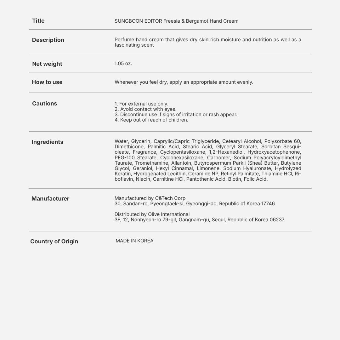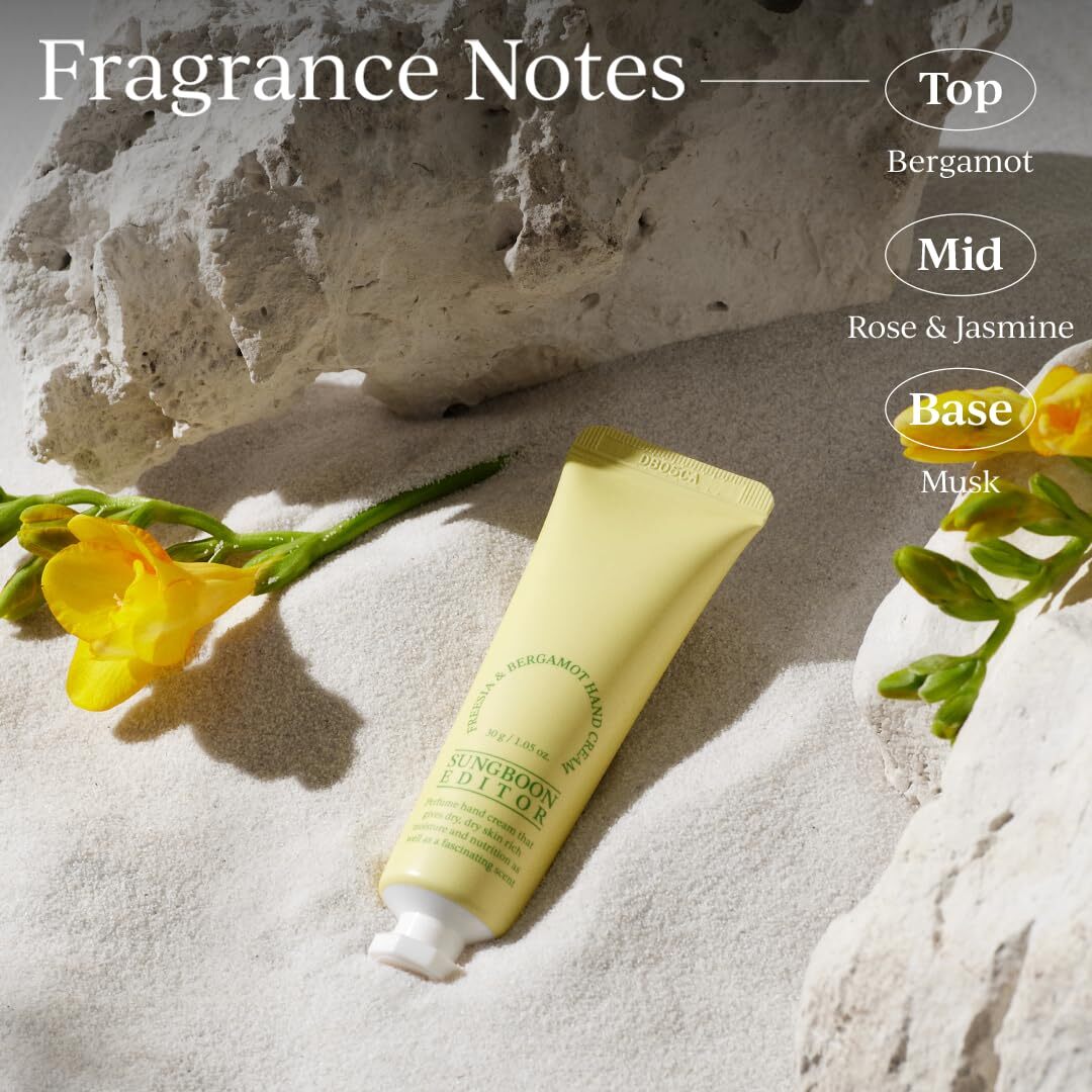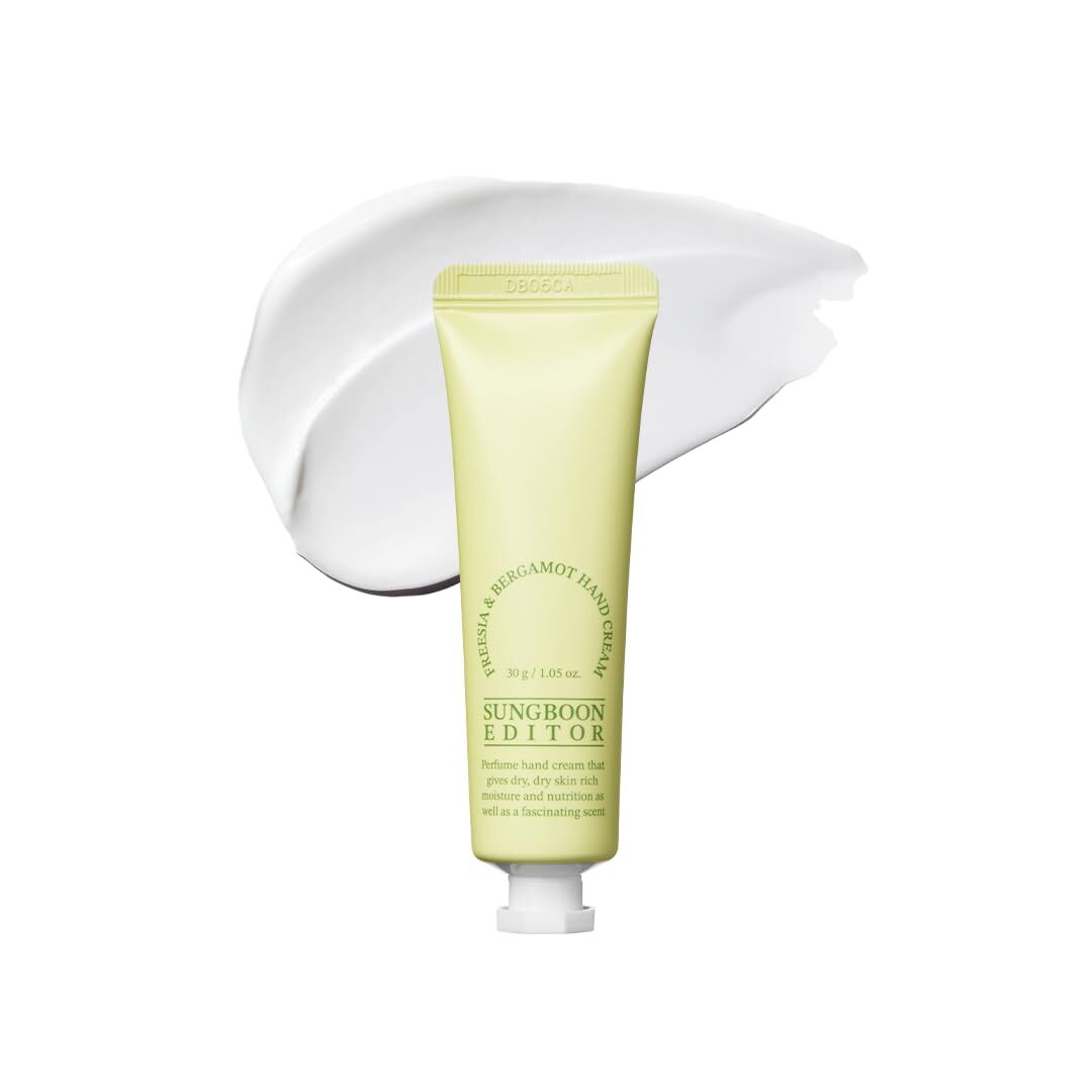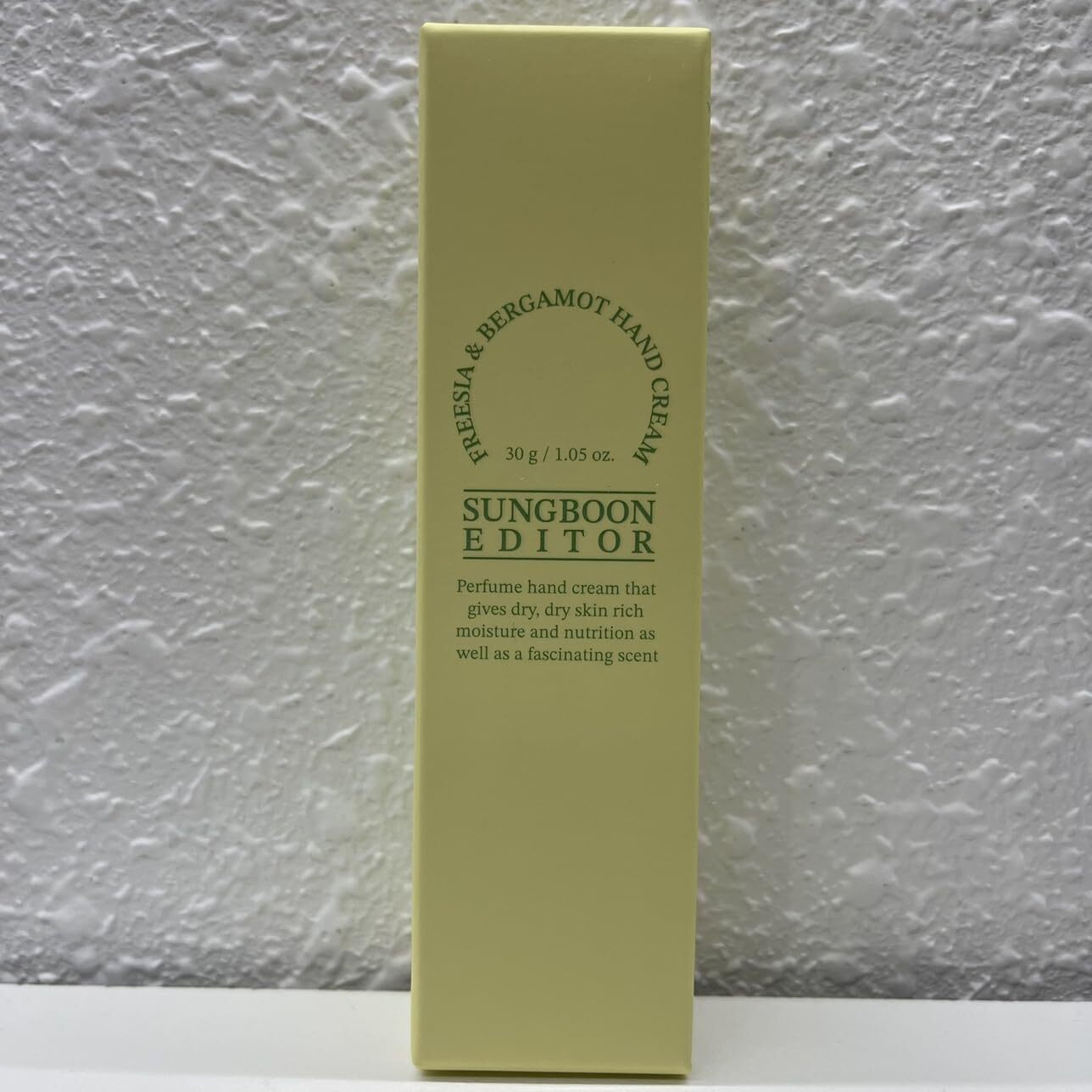 Sungboon Editor Freesia & Bergamot Hand Cream 30g — питательный и увлажняющий крем для рук с лёгкой текстурой и утончённым ароматом фрезии и бергамота. Средство мгновенно смягчает кожу, устраняет сухость и шелушения, делает руки гладкими и ухоженными.