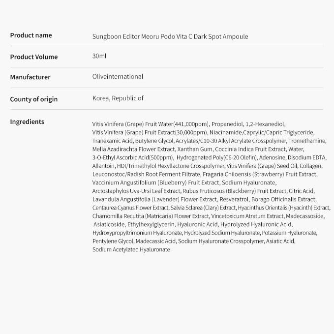 Sungboon Editor Meoru Podo VitaC Dark Spot Ampoule — концентрированная ампула с витамином C, специально рассчитанная на осветление кожи, борьбу с пятнами и выравнивание тона. Средство сочетает мощные осветляющие ингредиенты и ухаживающие компоненты, которые стимулируют здоровый и ровный цвет кожи.